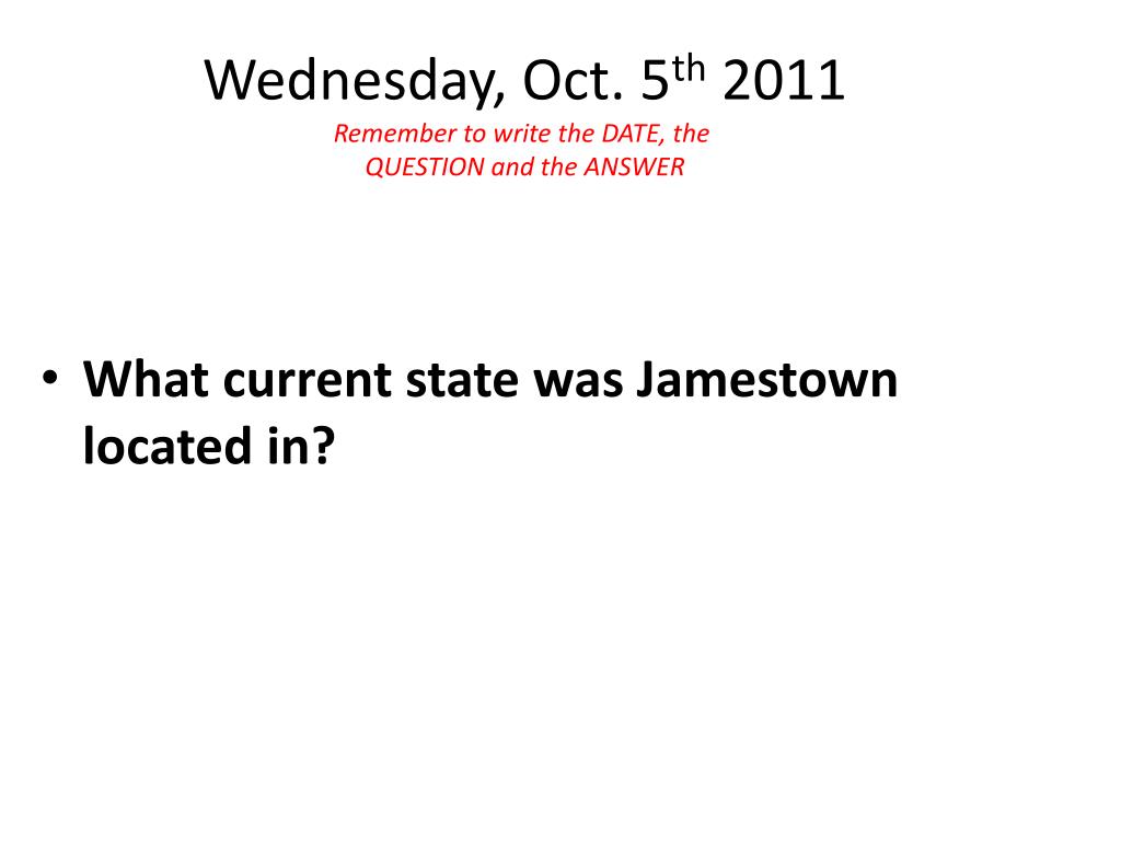 Wednesday, Oct. 5th 2011 Remember to write the DATE, the QUESTION and the ANSWER • What current state was Jamestown located in?