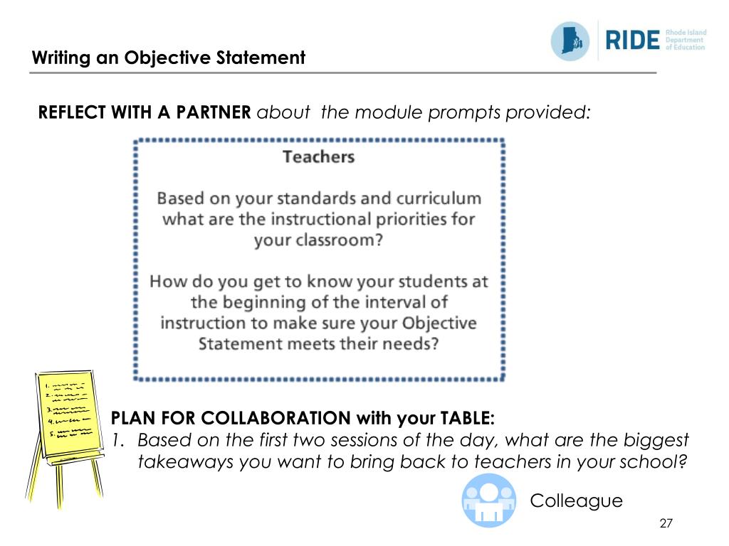 Writing an Objective Statement • REFLECT WITH A PARTNER about the module prompts provided: • PLAN FOR COLLABORATION with your TABLE: • Based on the first two sessions of the day, what are the biggest takeaways you want to bring back to teachers in your school? Colleague