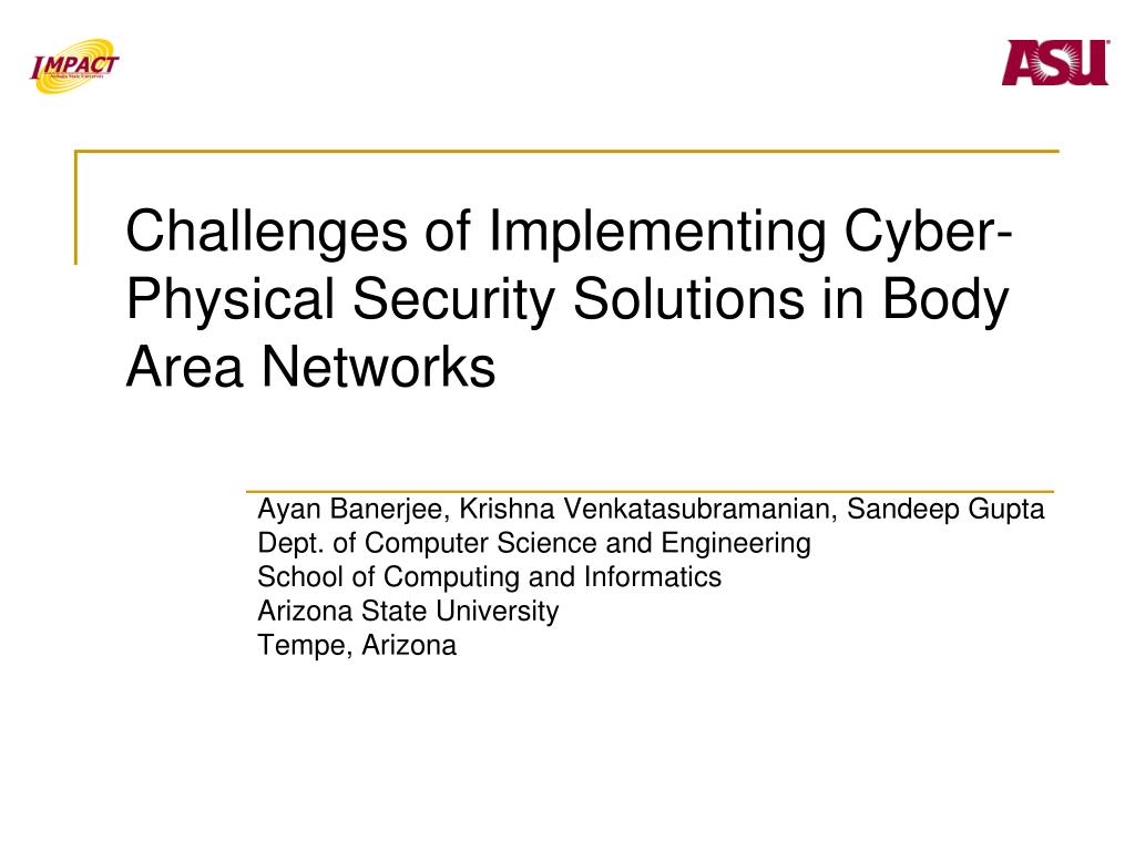 Challenges of Implementing Cyber-Physical Security Solutions in Body Area Networks Ayan Banerjee, Krishna Venkatasubramanian, Sandeep Gupta Dept. of Computer Science and Engineering School of Computing and Informatics Arizona State University Tempe, Arizona