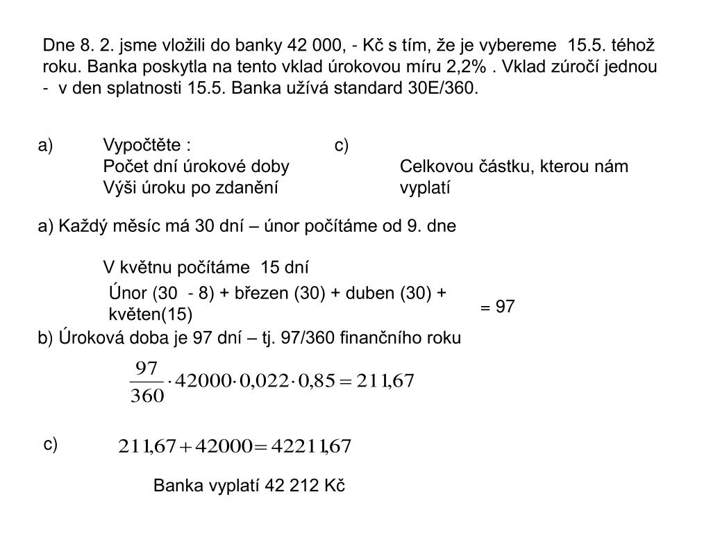 Dne 8. 2. jsme vložili do banky 42 000, - Kč s tím, že je vybereme 15.5. téhož roku. Banka poskytla na tento vklad úrokovou míru 2,2% . Vklad zúročí jednou - v den splatnosti 15.5. Banka užívá standard 30E/360. • Vypočtěte :Počet dní úrokové dobyVýši úroku po zdanění • Celkovou částku, kterou nám vyplatí a) Každý měsíc má 30 dní – únor počítáme od 9. dne V květnu počítáme 15 dní Únor (30 - 8) + březen (30) + duben (30) + květen(15) = 97 b) Úroková doba je 97 dní – tj. 97/360 finančního roku c) Banka vyplatí 42 212 Kč