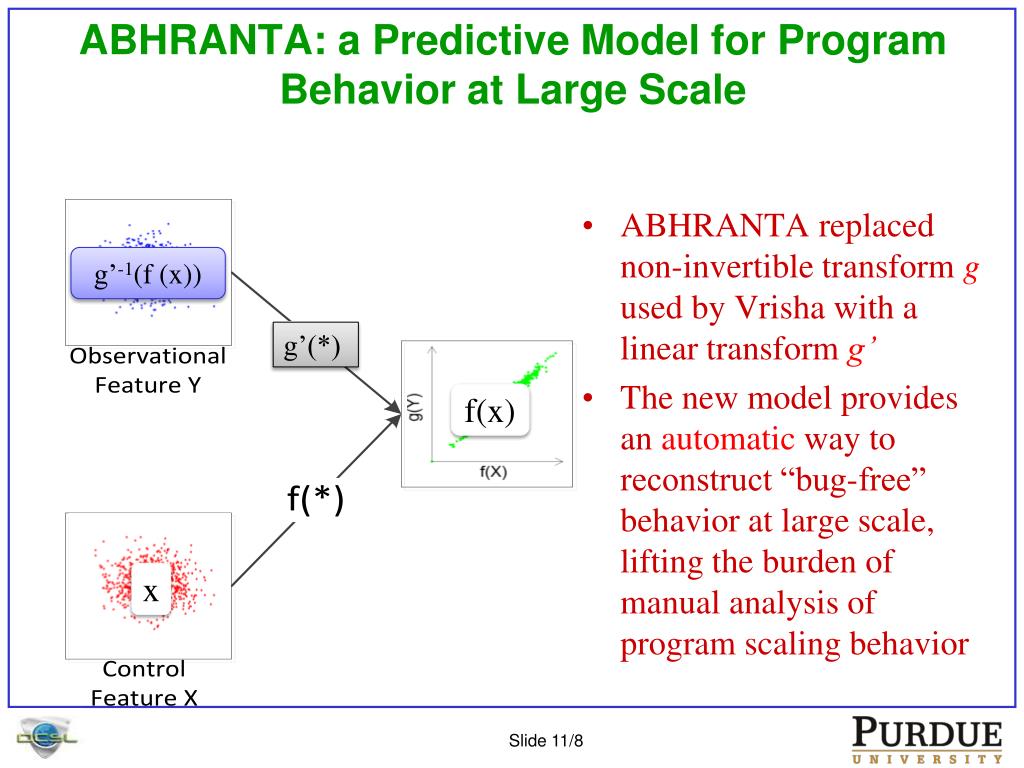 ABHRANTA: a Predictive Model for Program Behavior at Large Scale • ABHRANTA replaced non-invertible transform gused by Vrisha with a linear transform g’ • The new model provides an automatic way to reconstruct “bug-free” behavior at large scale, lifting the burden of manual analysis of program scaling behavior g’-1(f (x)) g’(*) f(x) x