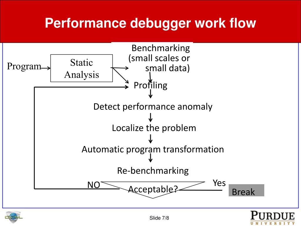 Performance debugger work flow Benchmarking (small scales or small data) Static Analysis Program Profiling Detect performance anomaly Localize the problem Automatic program transformation Re-benchmarking Yes NO Acceptable? Break