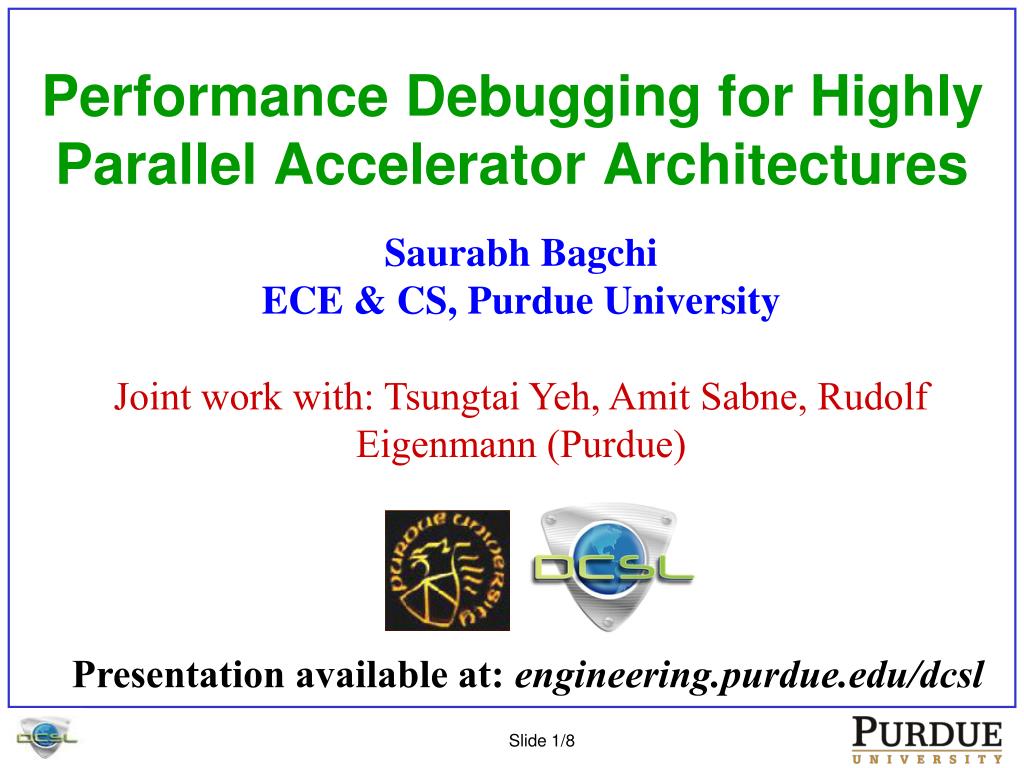 Saurabh Bagchi ECE & CS, Purdue University Joint work with: Tsungtai Yeh, Amit Sabne, Rudolf Eigenmann (Purdue) Performance Debugging for Highly Parallel Accelerator Architectures Presentation available at: engineering.purdue.edu/dcsl