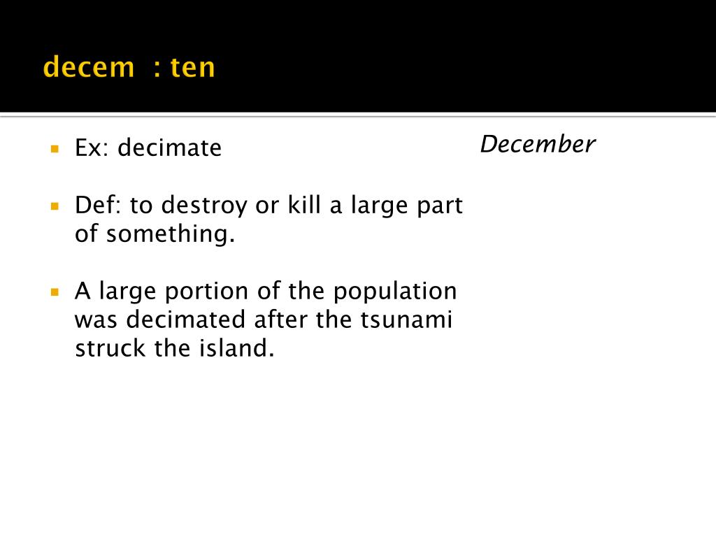 decem : ten December • Ex: decimate • Def: to destroy or kill a large part of something. • A large portion of the population was decimated after the tsunami struck the island.