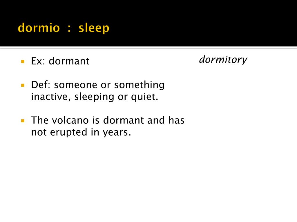 dormio : sleep dormitory • Ex: dormant • Def: someone or something inactive, sleeping or quiet. • The volcano is dormant and has not erupted in years.