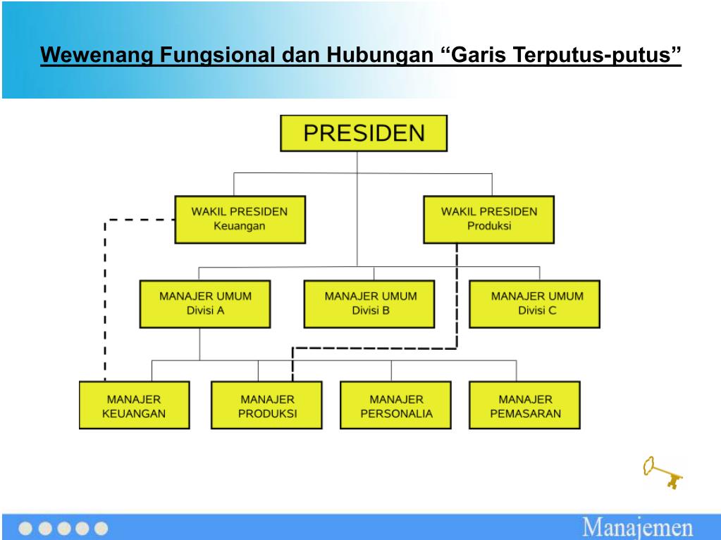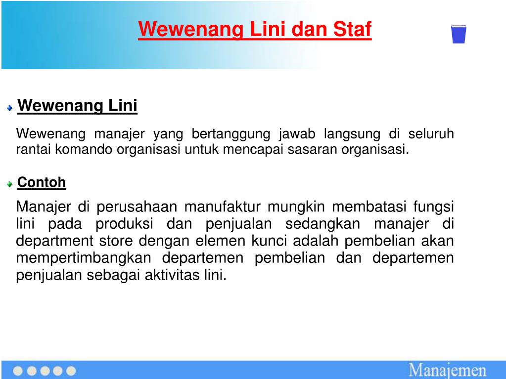 Wewenang Lini dan Staf Wewenang Lini Wewenang manajer yang bertanggung jawab langsung di seluruh rantai komando organisasi untuk mencapai sasaran organisasi. Contoh Manajer di perusahaan manufaktur mungkin membatasi fungsi lini pada produksi dan penjualan sedangkan manajer di department store dengan elemen kunci adalah pembelian akan mempertimbangkan departemen pembelian dan departemen penjualan sebagai aktivitas lini.