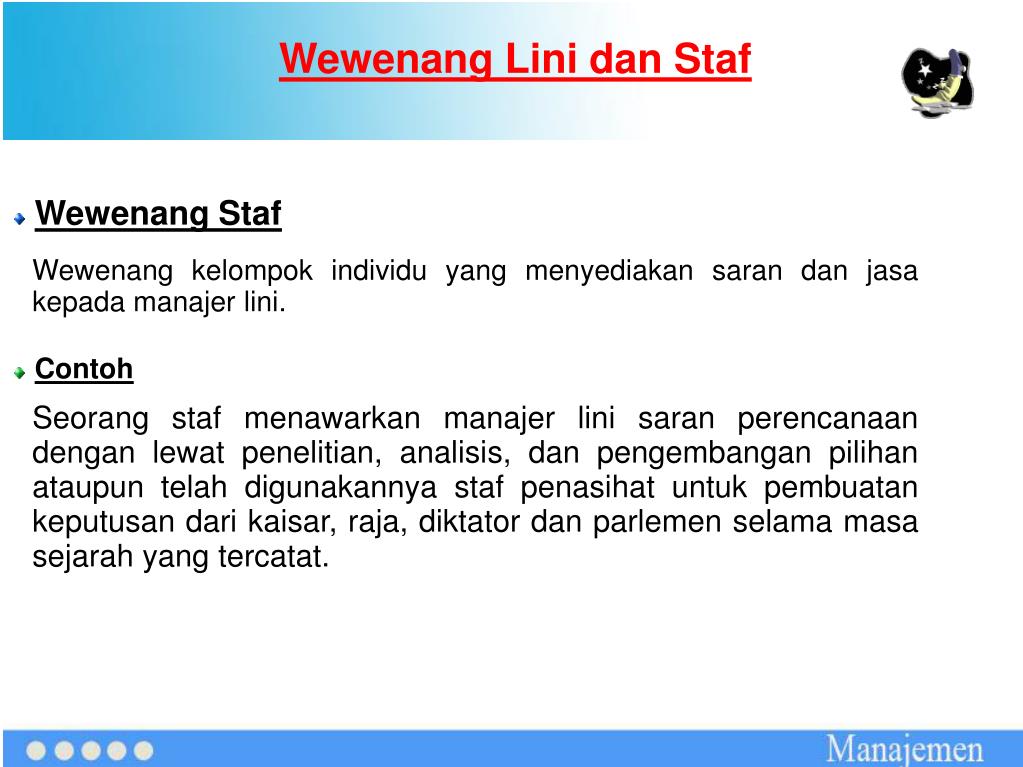 Wewenang Lini dan Staf Wewenang Staf Wewenang kelompok individu yang menyediakan saran dan jasa kepada manajer lini. Contoh Seorang staf menawarkan manajer lini saran perencanaan dengan lewat penelitian, analisis, dan pengembangan pilihan ataupun telah digunakannya staf penasihat untuk pembuatan keputusan dari kaisar, raja, diktator dan parlemen selama masa sejarah yang tercatat.