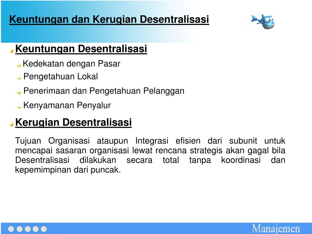 Keuntungan dan Kerugian Desentralisasi Keuntungan Desentralisasi Kedekatan dengan Pasar Pengetahuan Lokal Penerimaan dan Pengetahuan Pelanggan Kenyamanan Penyalur Kerugian Desentralisasi Tujuan Organisasi ataupun Integrasi efisien dari subunit untuk mencapai sasaran organisasi lewat rencana strategis akan gagal bila Desentralisasi dilakukan secara total tanpa koordinasi dan kepemimpinan dari puncak.