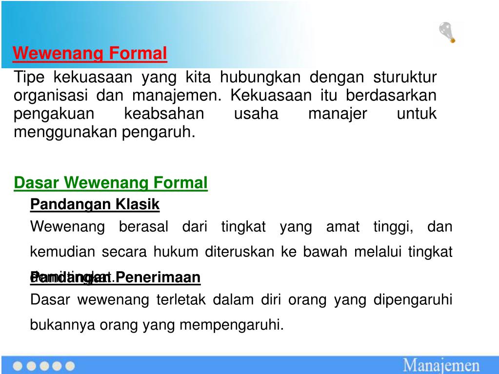 Wewenang Formal Tipe kekuasaan yang kita hubungkan dengan sturuktur organisasi dan manajemen. Kekuasaan itu berdasarkan pengakuan keabsahan usaha manajer untuk menggunakan pengaruh. Dasar Wewenang Formal Pandangan Klasik Wewenang berasal dari tingkat yang amat tinggi, dan kemudian secara hukum diteruskan ke bawah melalui tingkat demi tingkat. Pandangan Penerimaan Dasar wewenang terletak dalam diri orang yang dipengaruhi bukannya orang yang mempengaruhi.