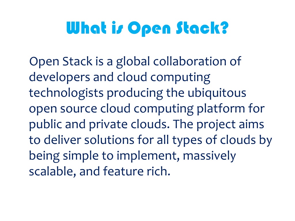 What is Open Stack? Open Stack is a global collaboration of developers and cloud computing technologists producing the ubiquitous open source cloud computing platform for public and private clouds. The project aims to deliver solutions for all types of clouds by being simple to implement, massively scalable, and feature rich.