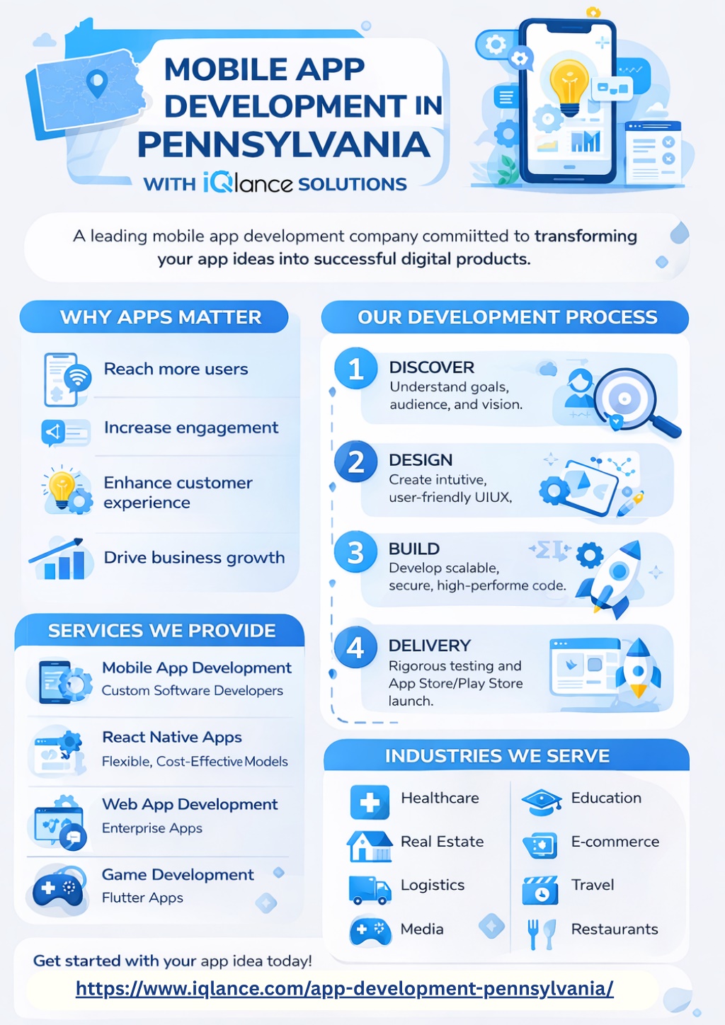 Discover the essentials of mobile app development in Pennsylvania, from concept to launch. See how smart design and modern technology create apps that engage users and support long-term business success.