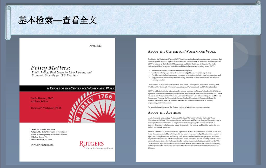 基本检索——详细信息 点击这里,可以获取全文资源 这是由罗格斯大学的妇女和工作中心撰写的一份研究报告,名为:《政策问题:美国工人的公共政策、新父母的带薪休假和经济保障》 详细记录 (上半部分) 详细信息 (下半部分)
