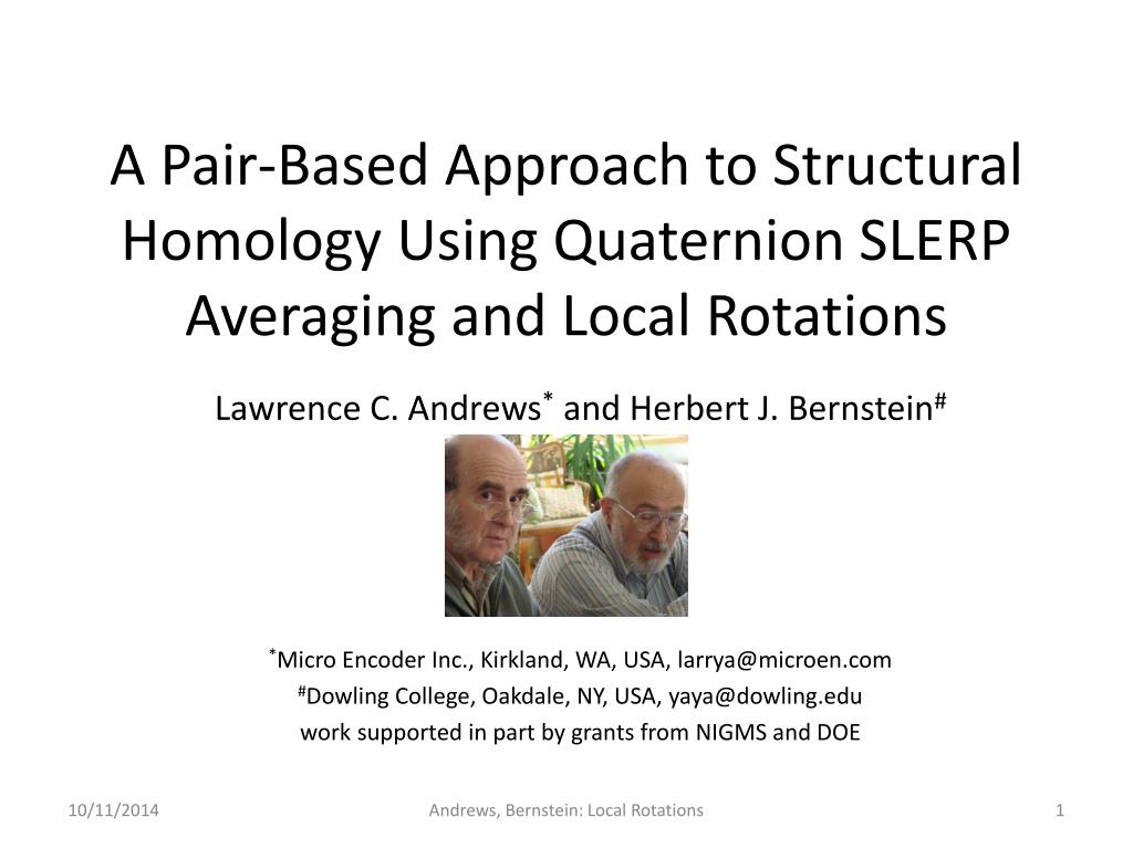 A Pair-Based Approach to Structural Homology Using Quaternion SLERP Averaging and Local Rotations. Lawrence C. Andrews * and Herbert J. Bernstein #. * Micro Encoder Inc., Kirkland, WA, USA, larrya@microen.com # Dowling College, Oakdale, NY, USA, yaya@dowling.edu