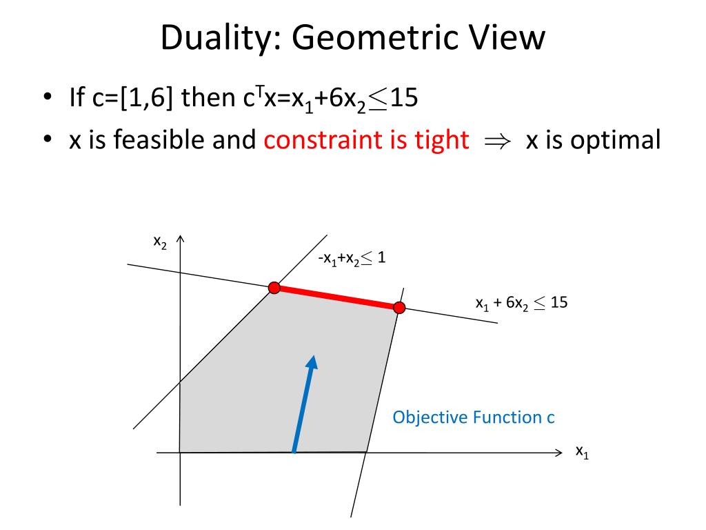Duality: Geometric View • If c=[1,6] then cTx=x1+6x2·15 • x is feasible and constraint is tight ) x is optimal x2 -x1+x2· 1 x1 + 6x2· 15 Objective Function c x1