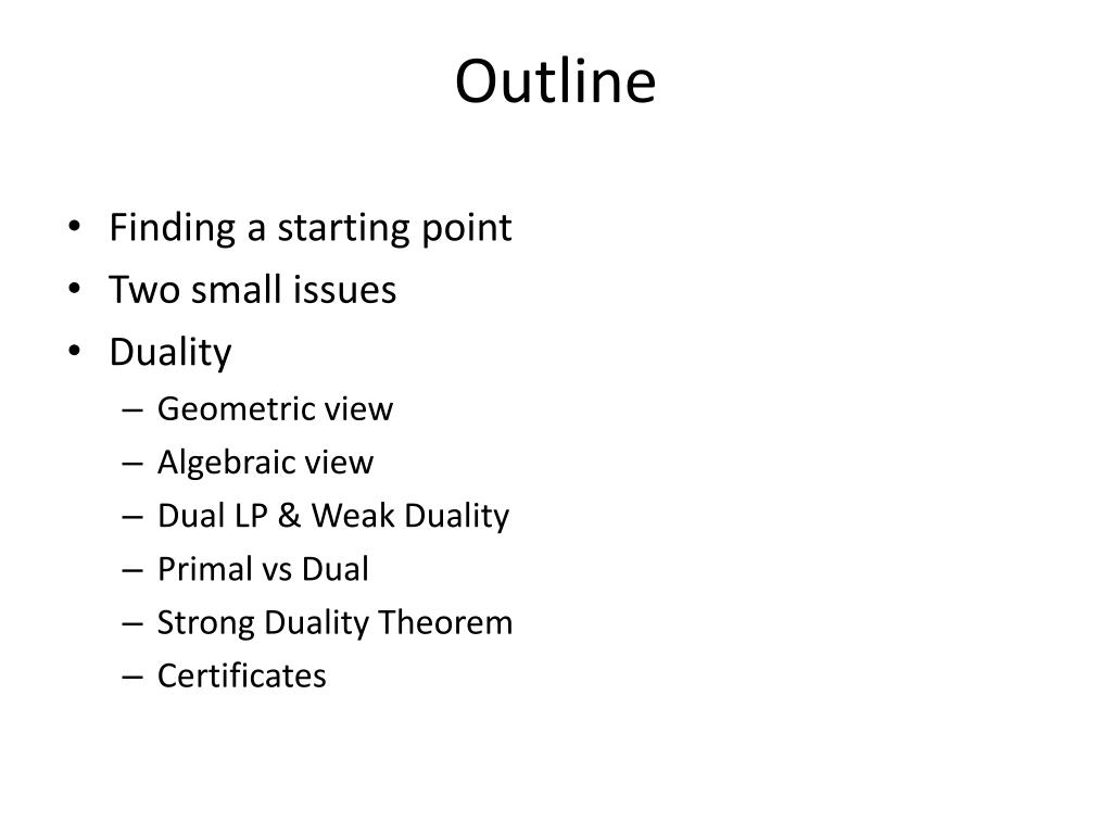 Outline • Finding a starting point • Two small issues • Duality • Geometric view • Algebraic view • Dual LP & Weak Duality • Primal vs Dual • Strong Duality Theorem • Certificates