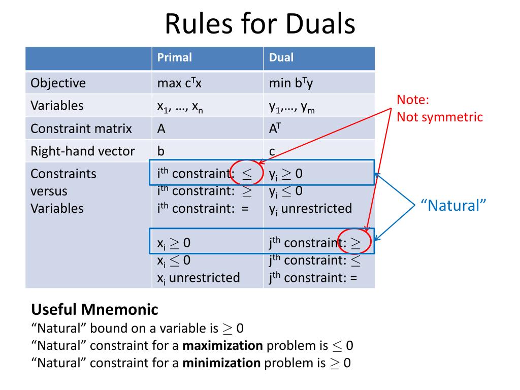 Rules for Duals Note:Not symmetric “Natural” Useful Mnemonic “Natural” bound on a variable is ¸ 0 “Natural” constraint for a maximization problem is · 0 “Natural” constraint for a minimization problem is ¸ 0
