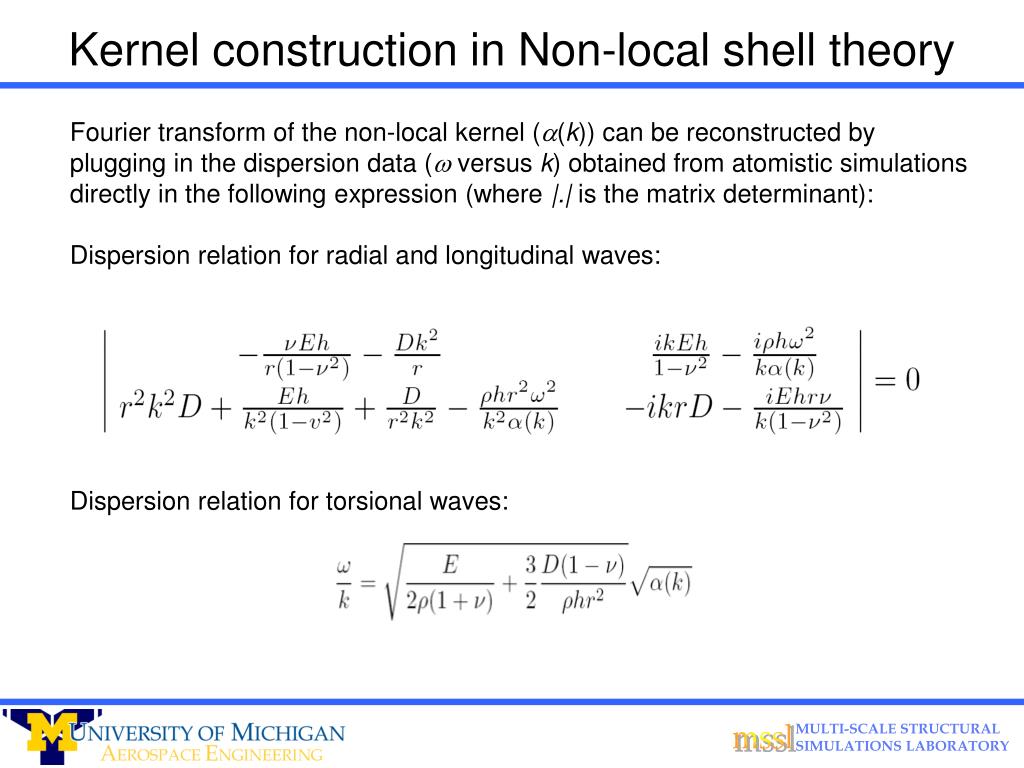 Kernel construction in Non-local shell theory Fourier transform of the non-local kernel (a(k)) can be reconstructed by plugging in the dispersion data (wversus k) obtained from atomistic simulations directly in the following expression (where |.| is the matrix determinant): Dispersion relation for radial and longitudinal waves: Dispersion relation for torsional waves: