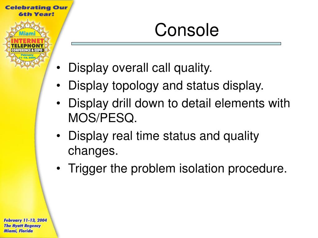 Console • Display overall call quality. • Display topology and status display. • Display drill down to detail elements with MOS/PESQ. • Display real time status and quality changes. • Trigger the problem isolation procedure.