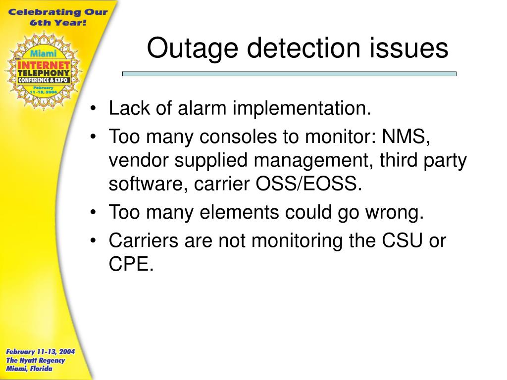 Outage detection issues • Lack of alarm implementation. • Too many consoles to monitor: NMS, vendor supplied management, third party software, carrier OSS/EOSS. • Too many elements could go wrong. • Carriers are not monitoring the CSU or CPE.