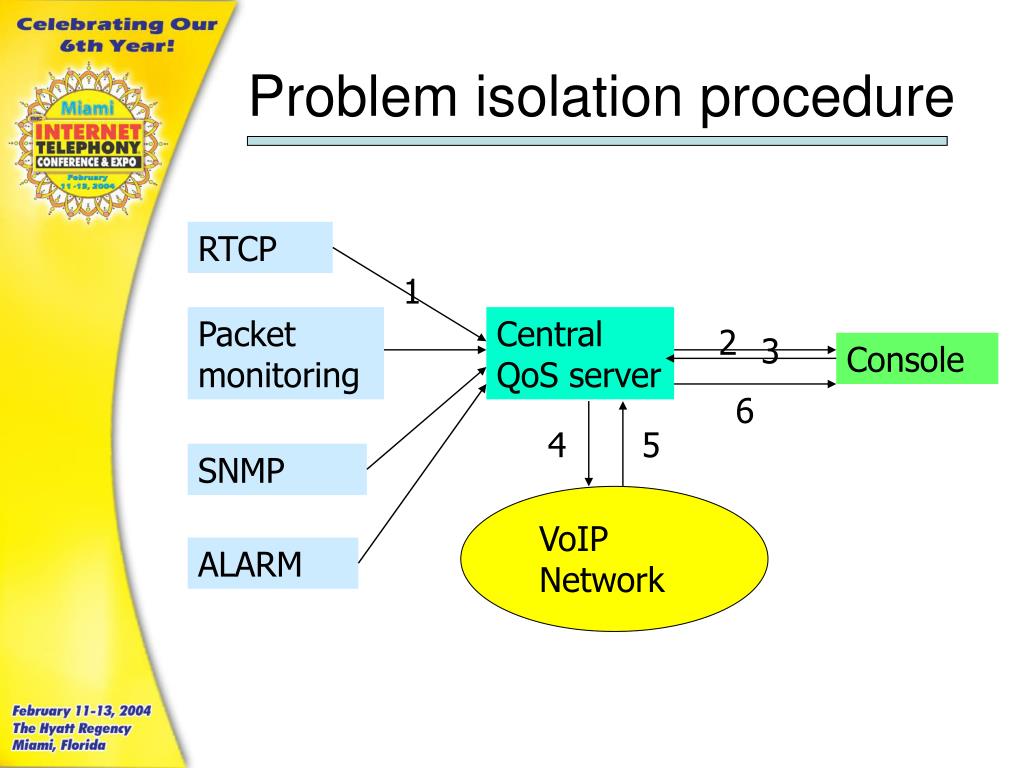 Problem isolation procedure RTCP 1 Packet monitoring Central QoS server 2 3 Console 6 4 5 SNMP VoIP Network ALARM
