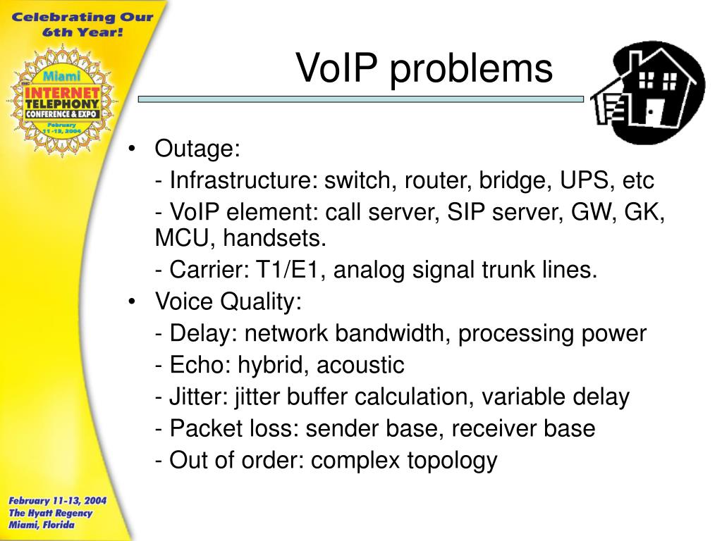 VoIP problems • Outage: - Infrastructure: switch, router, bridge, UPS, etc - VoIP element: call server, SIP server, GW, GK, MCU, handsets. - Carrier: T1/E1, analog signal trunk lines. • Voice Quality: - Delay: network bandwidth, processing power - Echo: hybrid, acoustic - Jitter: jitter buffer calculation, variable delay - Packet loss: sender base, receiver base - Out of order: complex topology