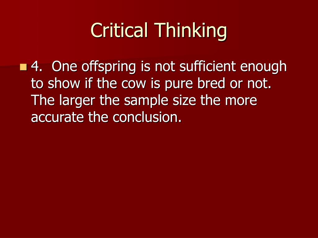 Critical Thinking • 4. One offspring is not sufficient enough to show if the cow is pure bred or not. The larger the sample size the more accurate the conclusion.