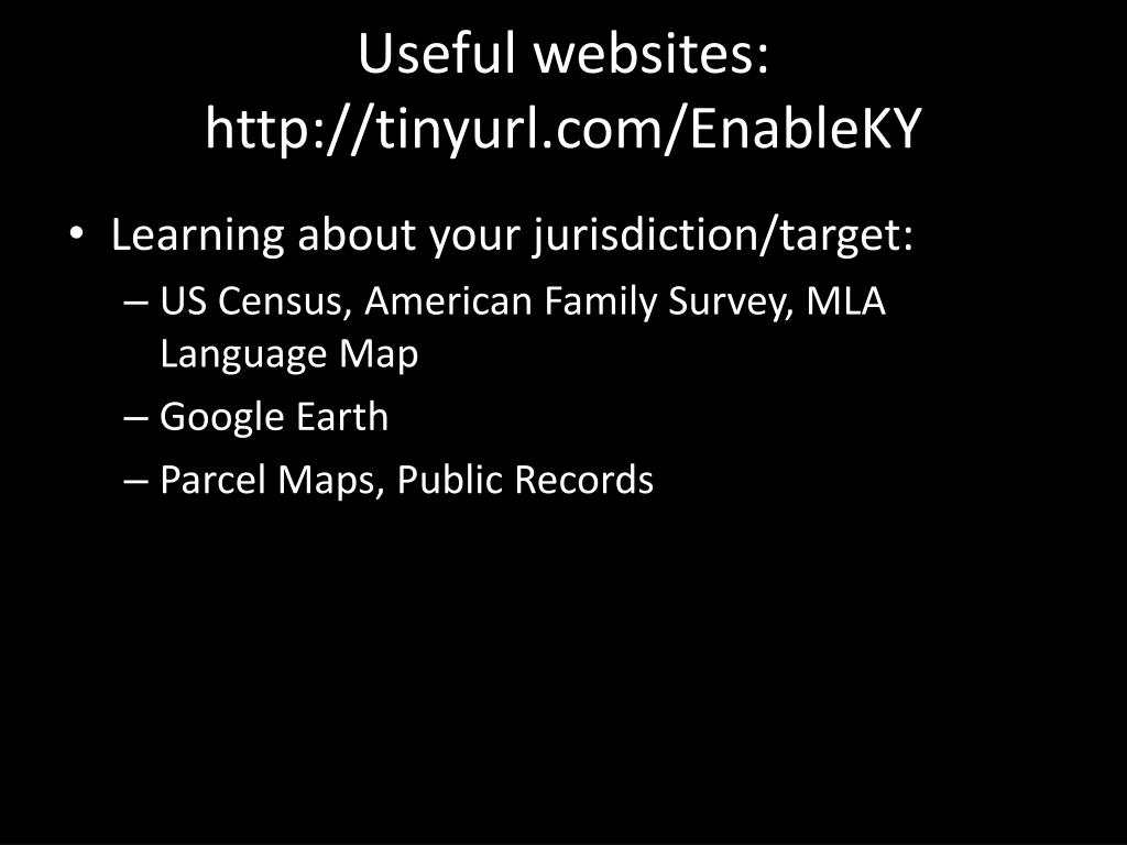 Useful websites: http://tinyurl.com/EnableKY • Learning about your jurisdiction/target: • US Census, American Family Survey, MLA Language Map • Google Earth • Parcel Maps, Public Records