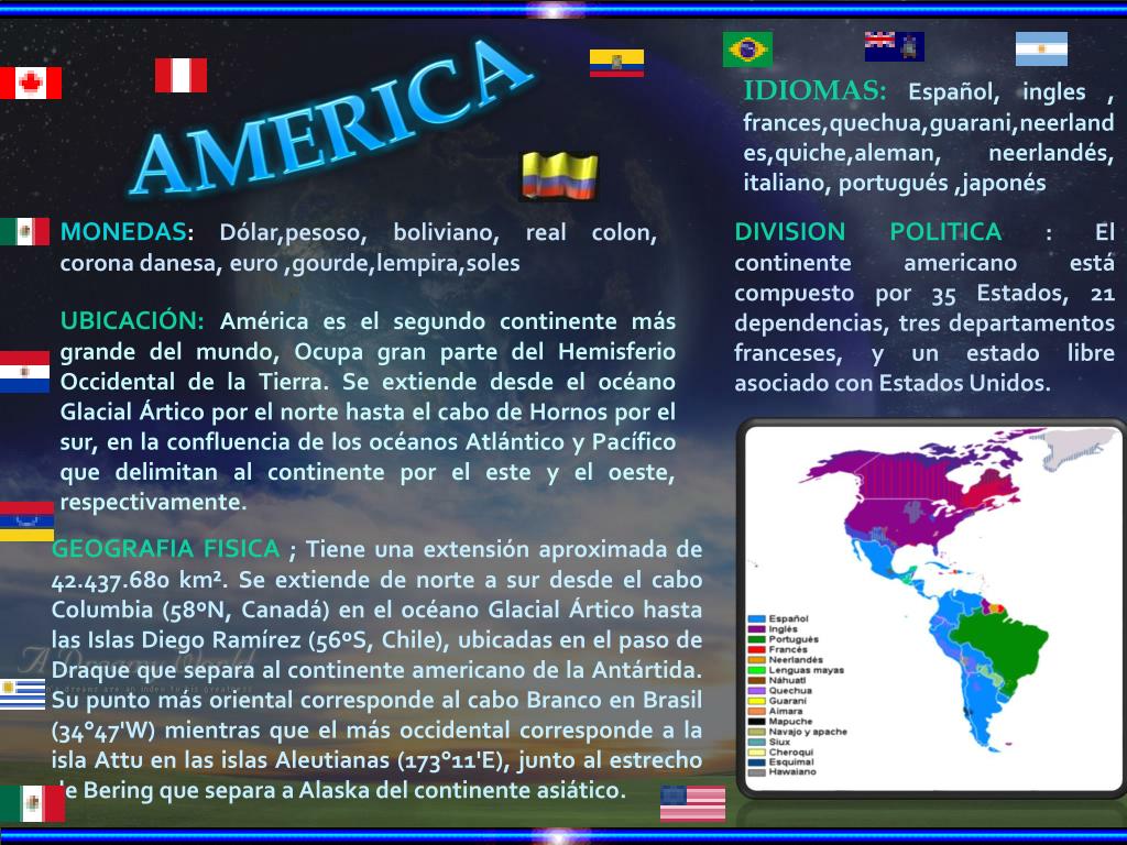 AMERICA IDIOMAS:Español, ingles , frances,quechua,guarani,neerlandes,quiche,aleman, neerlandés, italiano, portugués ,japonés DIVISION POLITICA : El continente americano está compuesto por 35 Estados, 21 dependencias, tres departamentos franceses, y un estado libre asociado con Estados Unidos. MONEDAS: Dólar,pesoso, boliviano, real colon, corona danesa, euro ,gourde,lempira,soles • UBICACIÓN: América es el segundo continente más grande del mundo, Ocupa gran parte del Hemisferio Occidental de la Tierra. Se extiende desde el océano Glacial Ártico por el norte hasta el cabo de Hornos por el sur, en la confluencia de los océanos Atlántico y Pacífico que delimitan al continente por el este y el oeste, respectivamente. GEOGRAFIA FISICA ; Tiene una extensión aproximada de 42.437.680 km². Se extiende de norte a sur desde el cabo Columbia (58ºN, Canadá) en el océano Glacial Ártico hasta las Islas Diego Ramírez (56ºS, Chile), ubicadas en el paso de Draque que separa al continente americano de la Antártida. Su punto más oriental corresponde al cabo Branco en Brasil (34°47'W) mientras que el más occidental corresponde a la isla Attu en las islas Aleutianas (173°11'E), junto al estrecho de Bering que separa a Alaska del continente asiático.