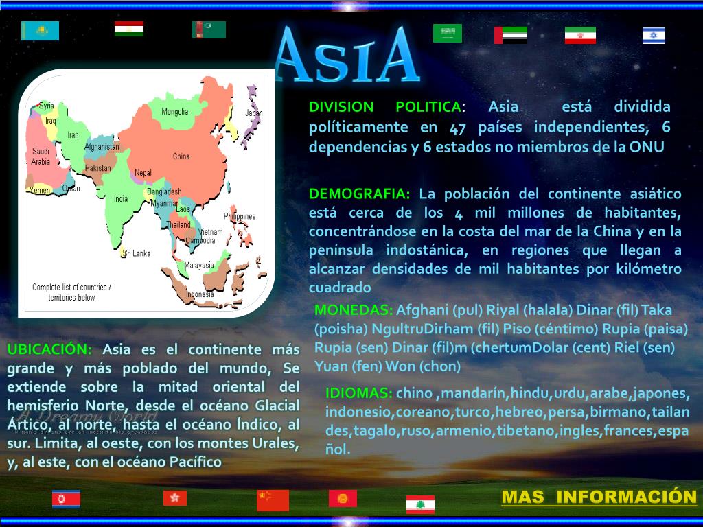 ASIA DIVISION POLITICA: Asia está dividida políticamente en 47 países independientes, 6 dependencias y 6 estados no miembros de la ONU DEMOGRAFIA: La población del continente asiático está cerca de los 4 mil millones de habitantes, concentrándose en la costa del mar de la China y en la península indostánica, en regiones que llegan a alcanzar densidades de mil habitantes por kilómetro cuadrado MONEDAS: Afghani (pul) Riyal (halala) Dinar (fil) Taka (poisha) NgultruDirham (fil) Piso (céntimo) Rupia (paisa) Rupia (sen) Dinar (fil)m (chertumDolar (cent) Riel (sen) Yuan (fen) Won (chon) UBICACIÓN: Asia es el continente más grande y más poblado del mundo, Se extiende sobre la mitad oriental del hemisferio Norte, desde el océano Glacial Ártico, al norte, hasta el océano Índico, al sur. Limita, al oeste, con los montes Urales, y, al este, con el océano Pacífico IDIOMAS: chino ,mandarín,hindu,urdu,arabe,japones, indonesio,coreano,turco,hebreo,persa,birmano,tailandes,tagalo,ruso,armenio,tibetano,ingles,frances,español. MAS INFORMACIÓN