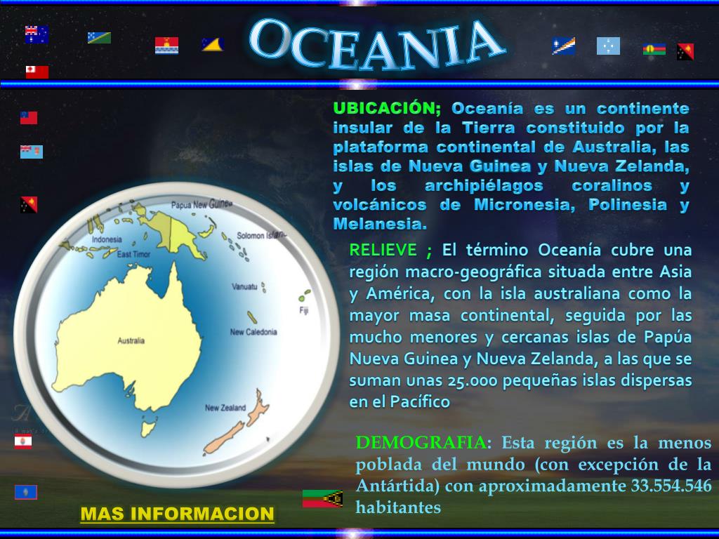 OCEANIA UBICACIÓN; Oceanía es un continente insular de la Tierra constituido por la plataforma continental de Australia, las islas de Nueva Guinea y Nueva Zelanda, y los archipiélagos coralinos y volcánicos de Micronesia, Polinesia y Melanesia. RELIEVE ; El término Oceanía cubre una región macro-geográfica situada entre Asia y América, con la isla australiana como la mayor masa continental, seguida por las mucho menores y cercanas islas de Papúa Nueva Guinea y Nueva Zelanda, a las que se suman unas 25.000 pequeñas islas dispersas en el Pacífico DEMOGRAFIA: Esta región es la menos poblada del mundo (con excepción de la Antártida) con aproximadamente 33.554.546 habitantes MAS INFORMACION