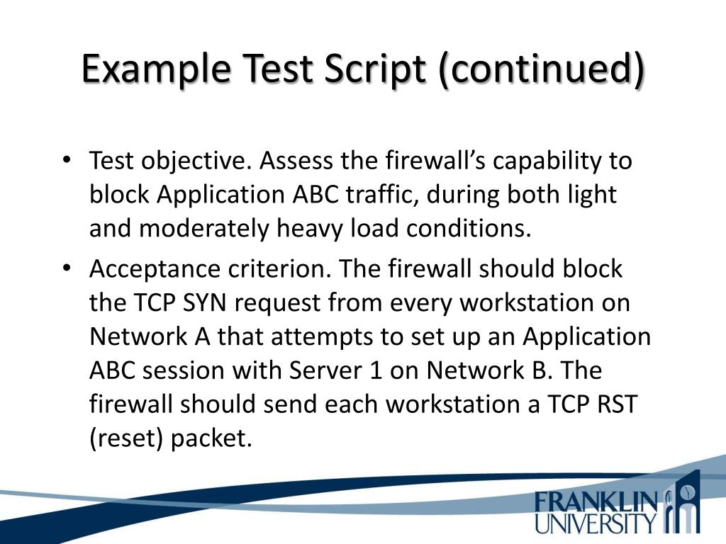 Example Test Script (continued) • Test objective. Assess the firewall’s capability to block Application ABC traffic, during both light and moderately heavy load conditions. • Acceptance criterion. The firewall should block the TCP SYN request from every workstation on Network A that attempts to set up an Application ABC session with Server 1 on Network B. The firewall should send each workstation a TCP RST (reset) packet.