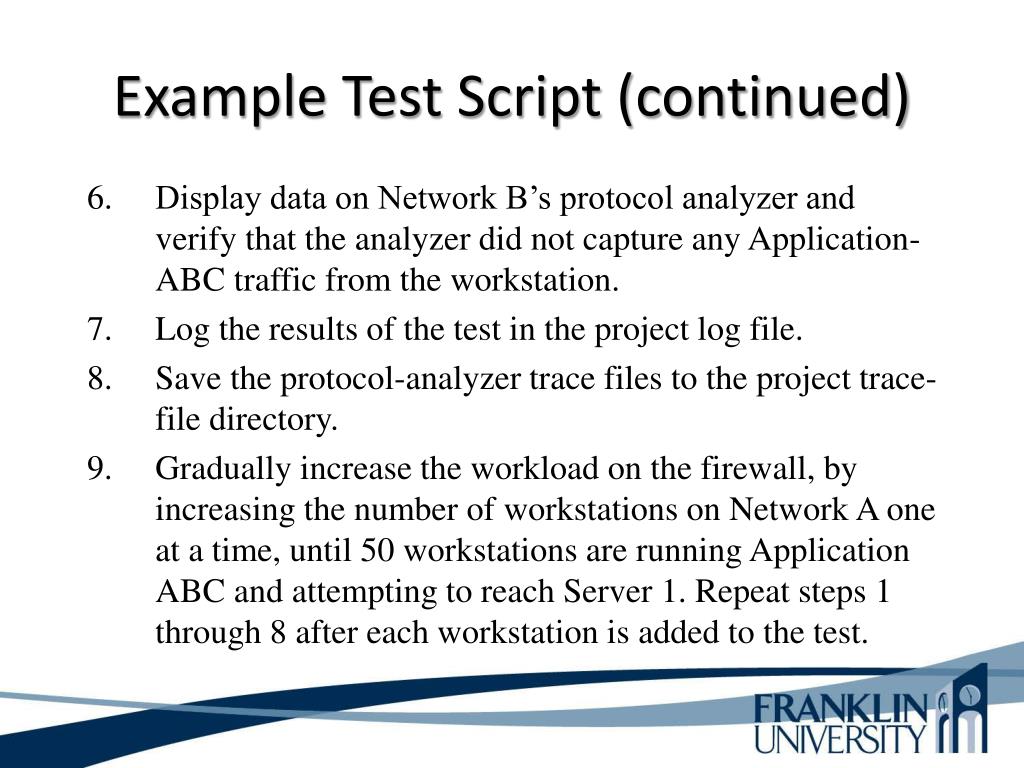 Example Test Script (continued) • Display data on Network B’s protocol analyzer and verify that the analyzer did not capture any Application-ABC traffic from the workstation. • Log the results of the test in the project log file. • Save the protocol-analyzer trace files to the project trace-file directory. • Gradually increase the workload on the firewall, by increasing the number of workstations on Network A one at a time, until 50 workstations are running Application ABC and attempting to reach Server 1. Repeat steps 1 through 8 after each workstation is added to the test.