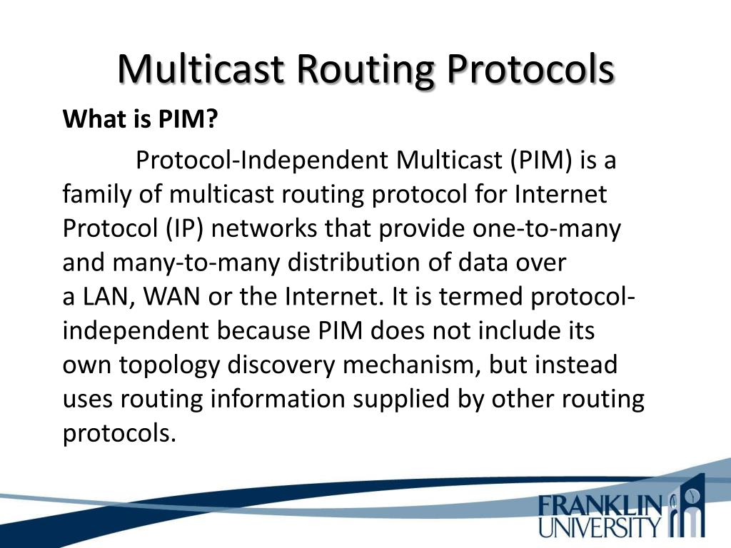 Multicast Routing Protocols What is PIM? Protocol-Independent Multicast (PIM) is a family of multicast routing protocol for Internet Protocol (IP) networks that provide one-to-many and many-to-many distribution of data over a LAN,WAN or the Internet. It is termed protocol-independent because PIM does not include its own topology discovery mechanism, but instead uses routing information supplied by other routing protocols.