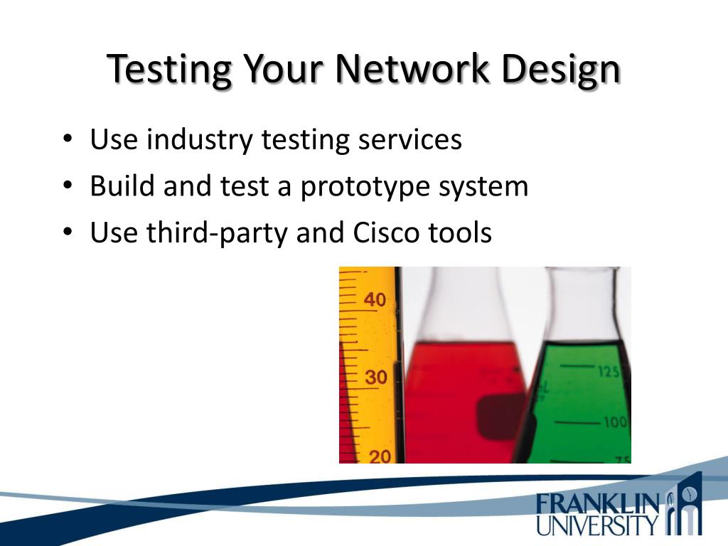 Testing Your Network Design • Use industry testing services • Build and test a prototype system • Use third-party and Cisco tools