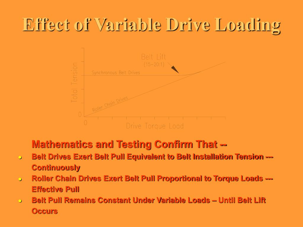 Effect of Variable Drive Loading Mathematics and Testing Confirm That -- • Belt Drives Exert Belt Pull Equivalent to Belt Installation Tension --- Continuously • Roller Chain Drives Exert Belt Pull Proportional to Torque Loads --- Effective Pull • Belt Pull Remains Constant Under Variable Loads – Until Belt Lift Occurs