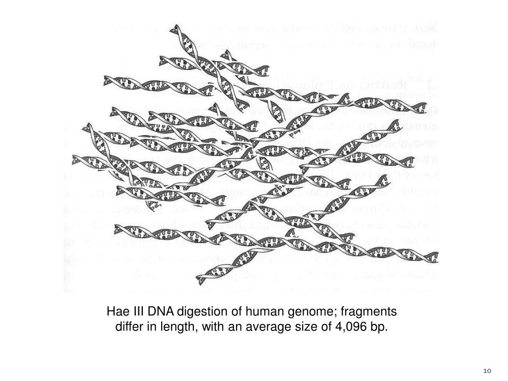 Hae III DNA digestion of human genome; fragments differ in length, with an average size of 4,096 bp.