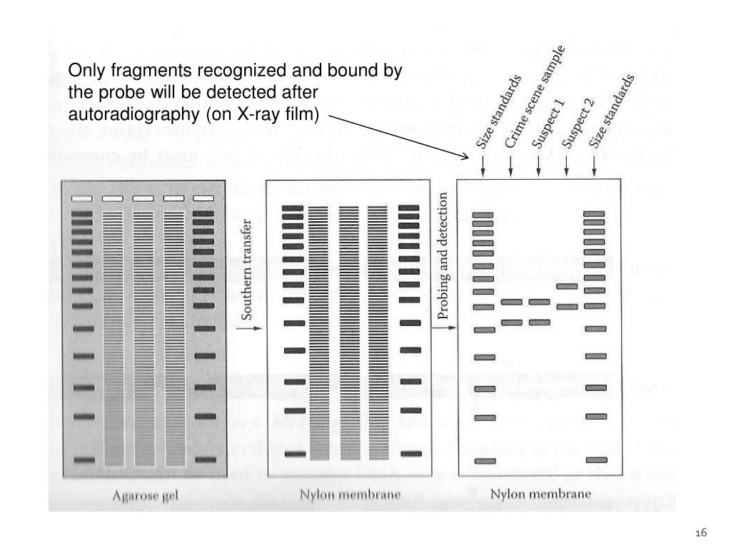 Detection: Restriction Fragment-Length Polymorphism (RFLP) • Steps: • Extract DNA from sample • Digest DNA with restriction endonucleases • Separate fragments on an agarose gel • Denature DNA in the gel (single-stranded) • Transfer DNA to a nitrocellulose or nylon membrane (binds tightly to ssDNA) • Hybridize membrane with radioactively-labeled locus-specific ssDNA probes • Detect VNTR lengths by autoradiography