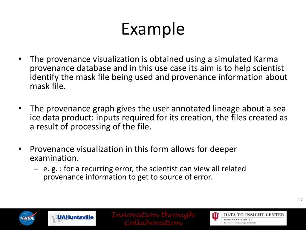 Example • The provenance visualization is obtained using a simulated Karma provenance database and in this use case its aim is to help scientist identify the mask file being used and provenance information about mask file. • The provenance graph gives the user annotated lineage about a sea ice data product: inputs required for its creation, the files created as a result of processing of the file. • Provenance visualization in this form allows for deeper examination. • e. g. : for a recurring error, the scientist can view all related provenance information to get to source of error.