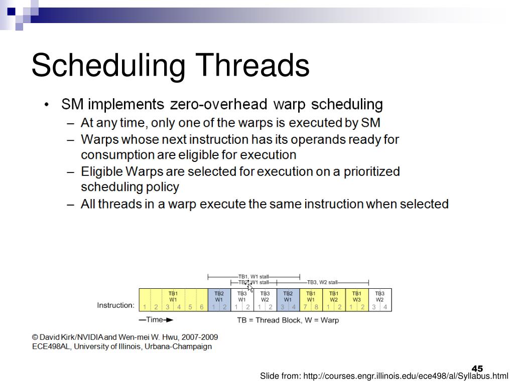 Scheduling Threads Slide from David Luebke: http://s08.idav.ucdavis.edu/luebke-nvidia-gpu-architecture.pdf