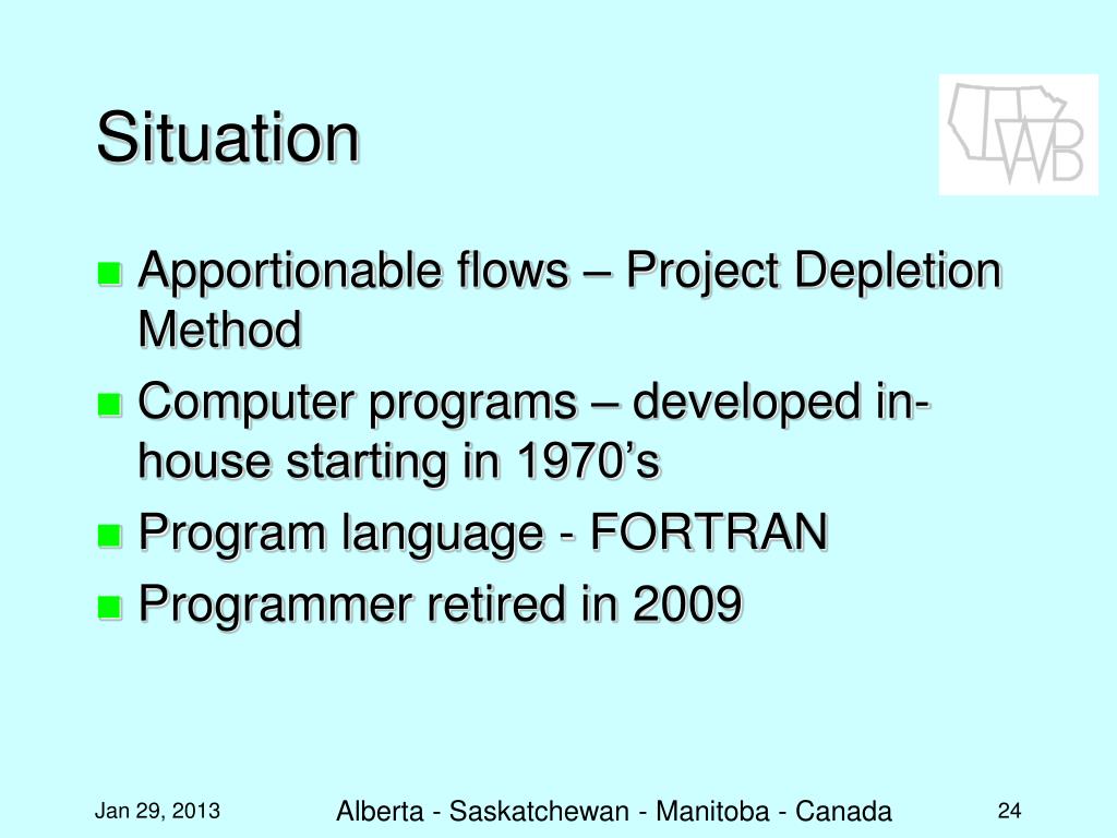Situation • Apportionable flows – Project Depletion Method • Computer programs – developed in-house starting in 1970’s • Program language - FORTRAN • Programmer retired in 2009 Alberta - Saskatchewan - Manitoba - Canada