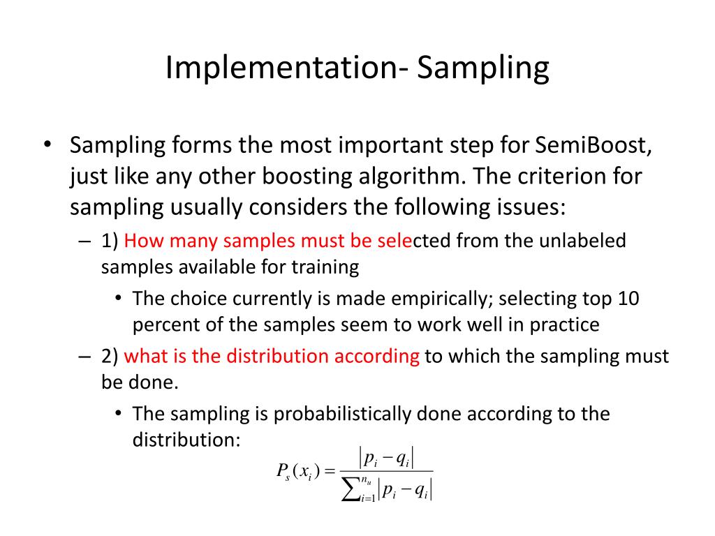 Implementation- Sampling • Sampling forms the most important step for SemiBoost, just like any other boosting algorithm. The criterion for sampling usually considers the following issues: • 1) How many samples must be selected from the unlabeled samples available for training • The choice currently is made empirically; selecting top 10 percent of the samples seem to work well in practice • 2) what is the distribution accordingto which the sampling must be done. • The sampling is probabilistically done according to the distribution: