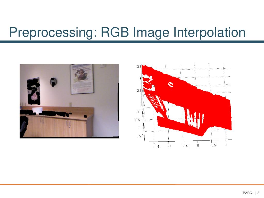 Line Segmentation • Get a 2D slice at certain fixed height: • We choose a height above common types of furniture to get wall outlines better. • Order points in the 2D slice along the camera viewing angle: • This allows more efficient line segmentation (without optimization). • Order is preserved during motion. • Two phases of line segmentation: • Linearization: move along the ordered points to form a line until it breaks • Clustering: merge two segments if they are almost align with each other break α new segment extend sin(α)>K min Ai>T Linearization Clustering