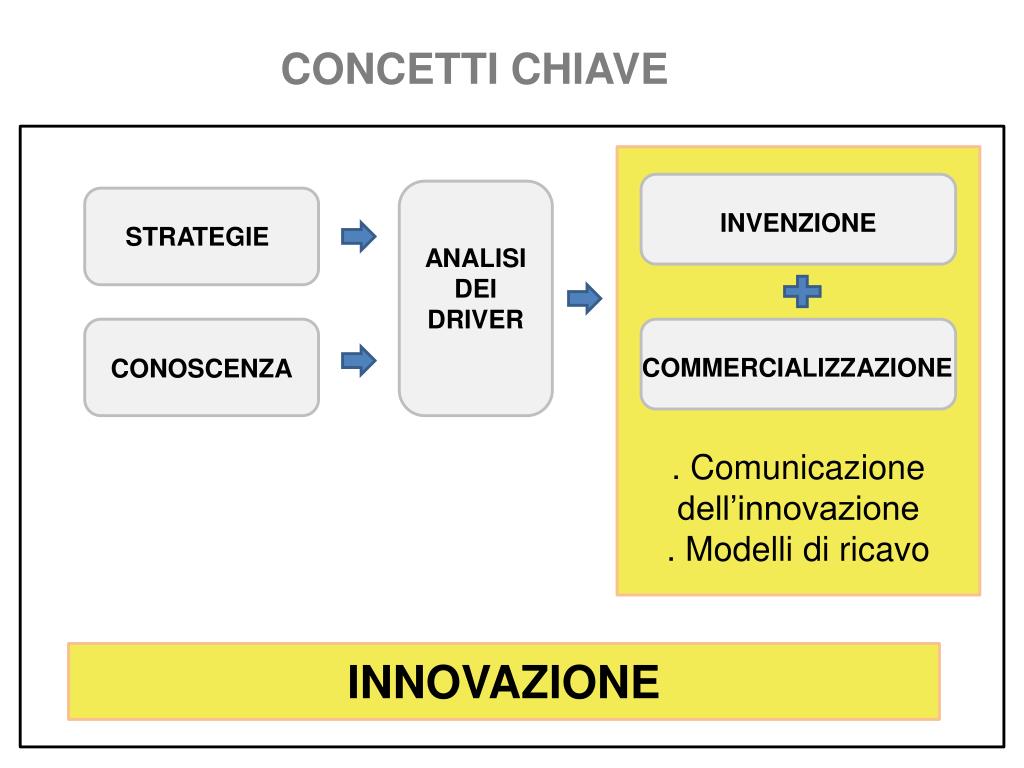 CONCETTI CHIAVE INVENZIONE STRATEGIE ANALISI DEI DRIVER COMMERCIALIZZAZIONE CONOSCENZA . Comunicazione dell’innovazione . Modelli di ricavo INNOVAZIONE