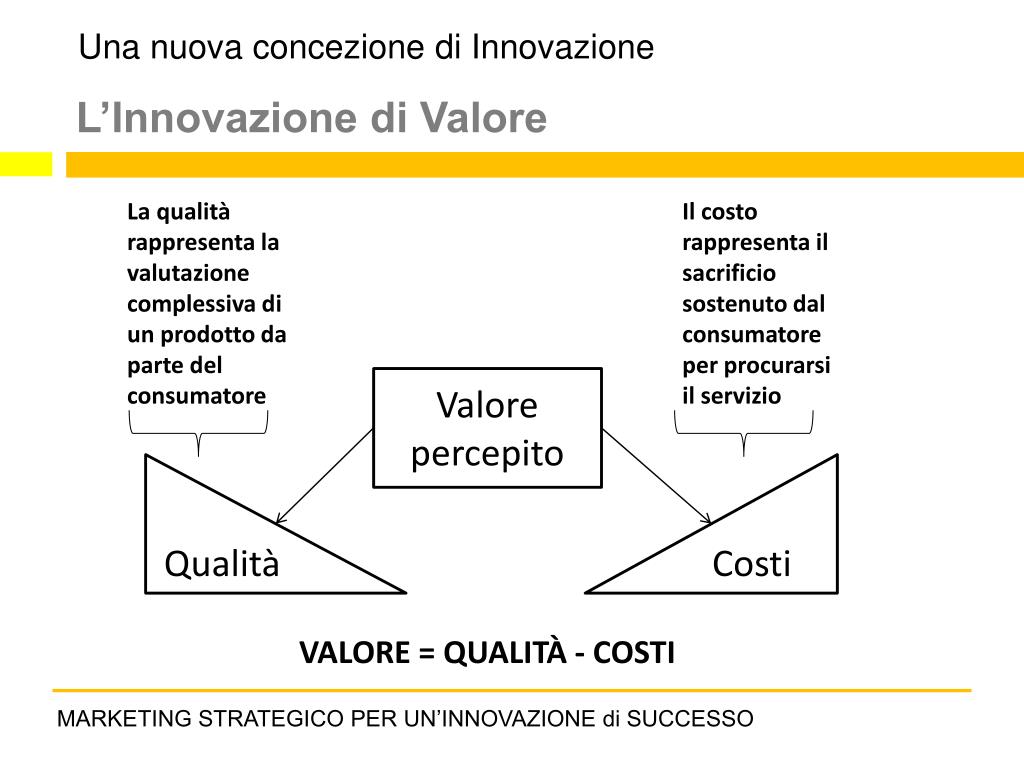 Una nuova concezione di Innovazione La qualità rappresenta la valutazione complessiva di un prodotto da parte del consumatore Il costo rappresenta il sacrificio sostenuto dal consumatore per procurarsi il servizio L’Innovazione di Valore Valore percepito Qualità Costi VALORE = QUALITÀ - COSTI