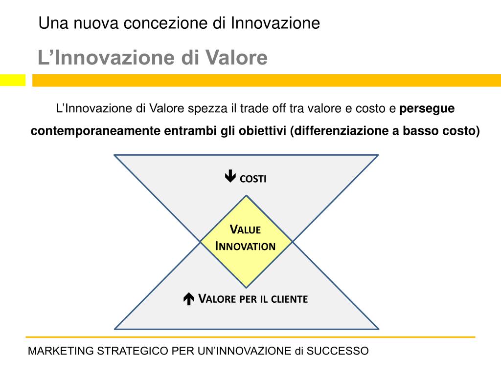 Una nuova concezione di Innovazione L’Innovazione di Valore L’Innovazione di Valore spezza il trade off tra valore e costo e persegue contemporaneamente entrambi gli obiettivi (differenziazione a basso costo) costi Value Innovation Valore per il cliente