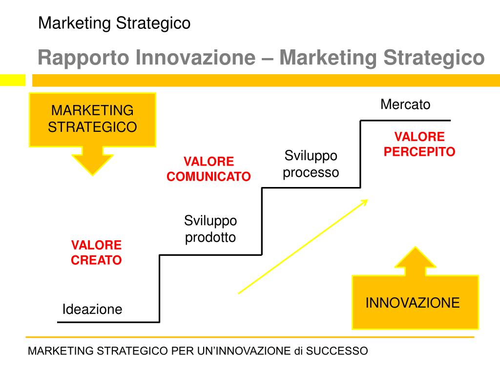 Marketing Strategico Mercato Rapporto Innovazione – Marketing Strategico MARKETING STRATEGICO Sviluppo processo VALORE PERCEPITO VALORE COMUNICATO Sviluppo prodotto VALORE CREATO INNOVAZIONE Ideazione