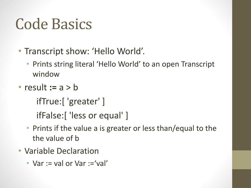 Code Basics • Transcript show: ‘Hello World’. • Prints string literal ‘Hello World’ to an open Transcript window • result := a > b ifTrue:[ 'greater' ] ifFalse:[ 'less or equal' ] • Prints if the value a is greater or less than/equal to the the value of b • Variable Declaration • Var := val or Var :=‘val’