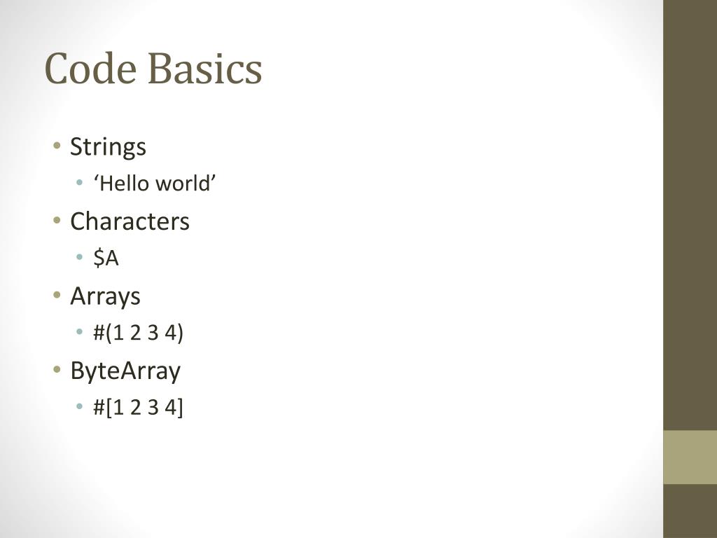 Code Basics • Strings • ‘Hello world’ • Characters • $A • Arrays • #(1 2 3 4) • ByteArray • #[1 2 3 4]