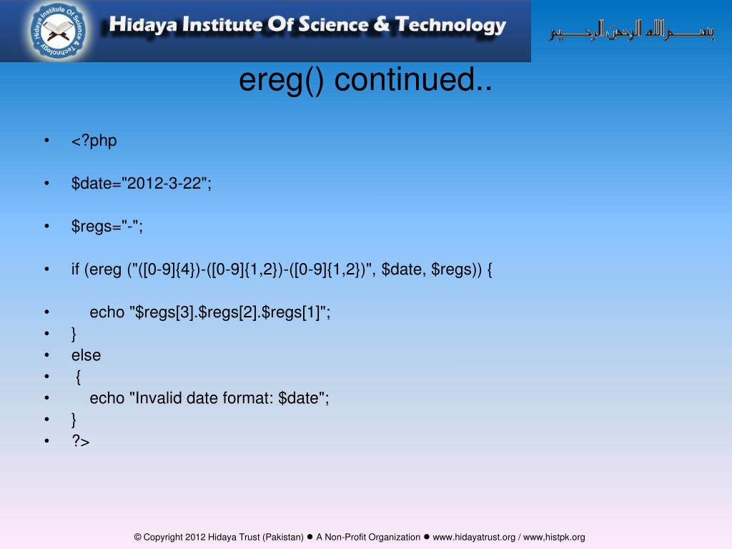 ereg() continued.. <?php $date="2012-3-22"; $regs="-"; if (ereg ("([0-9]{4})-([0-9]{1,2})-([0-9]{1,2})", $date, $regs)) { echo "$regs[3].$regs[2].$regs[1]"; } else { echo "Invalid date format: $date"; } ?>
