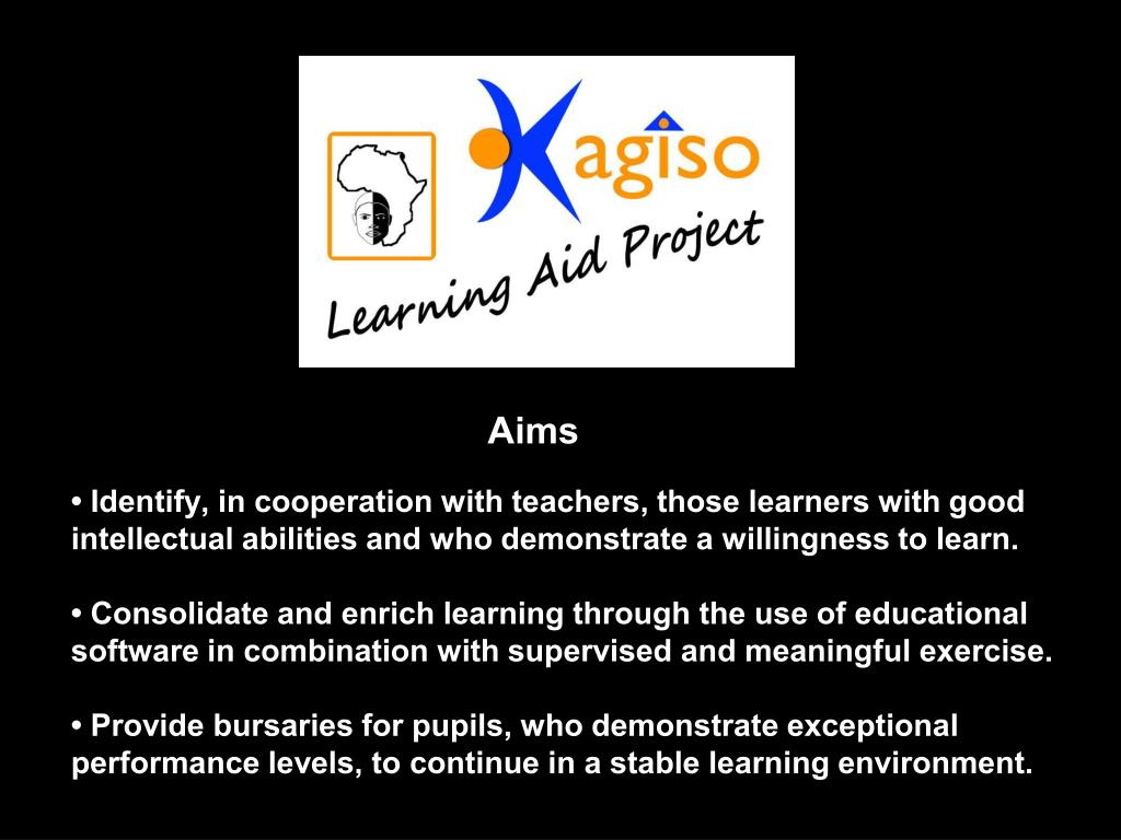 Aims • Identify, in cooperation with teachers, those learners with good intellectual abilities and who demonstrate a willingness to learn. • Consolidate and enrich learning through the use of educational software in combination with supervised and meaningful exercise. • Provide bursaries for pupils, who demonstrate exceptional performance levels, to continue in a stable learning environment.